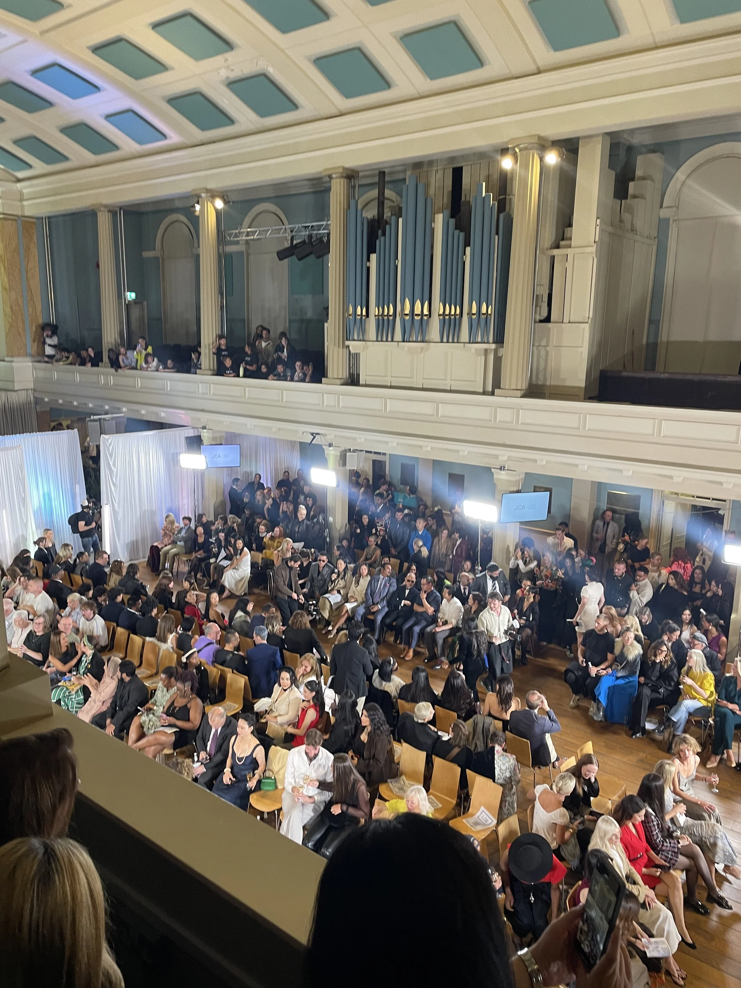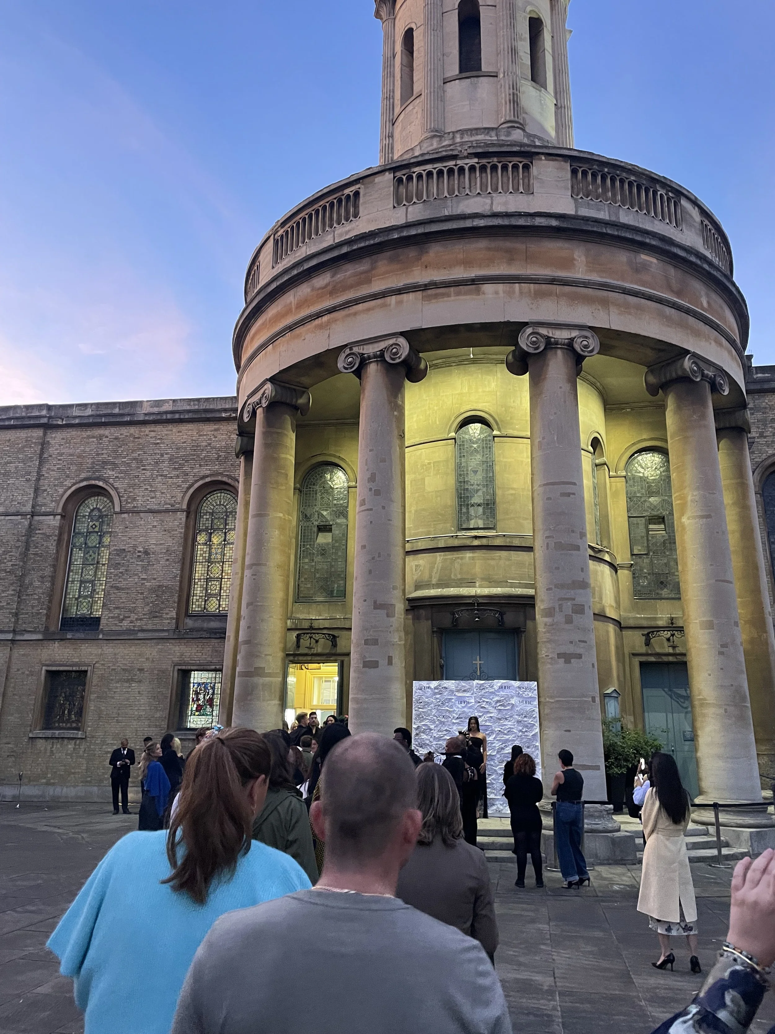 After nearly joining a fashionably dressed Christianity meeting (the show is taking place at a church so I put two and two together), I eventually get to the venue. A snaking queue of blazer-balenciaga wearing bright-eyed and bushy-tailed fashion industry folk greets me and I immediately feel out of my depth. I curse wearing the hottest material possible as I queue patiently in front of two girls discussing a mysterious James who apparently dropped out of the show last minute, which was supposedly such a shame as his collection had so much potential. From their conversation I gather that they are two young designers who had experienced their fair share of shows. I am left in awe by two men wearing matching Boy-George-on-steroids hats. The girls behind me are now oggling over a woman being snapped by a photographer at the entrance who is rumoured to be in Bridgerton (I smugly think that I am the only one in on the Styles Secret). For a second my ego gets to me and I fear too being snapped by the photographer and weigh up pose options . As more incredibly beautiful and well-dressed people join the queue, the sun sets and the church is bathed in colour, now set against a candyfloss backdrop of sunset. I pinch myself and head into the venue (and sigh with relief that I was actually on the guest list).