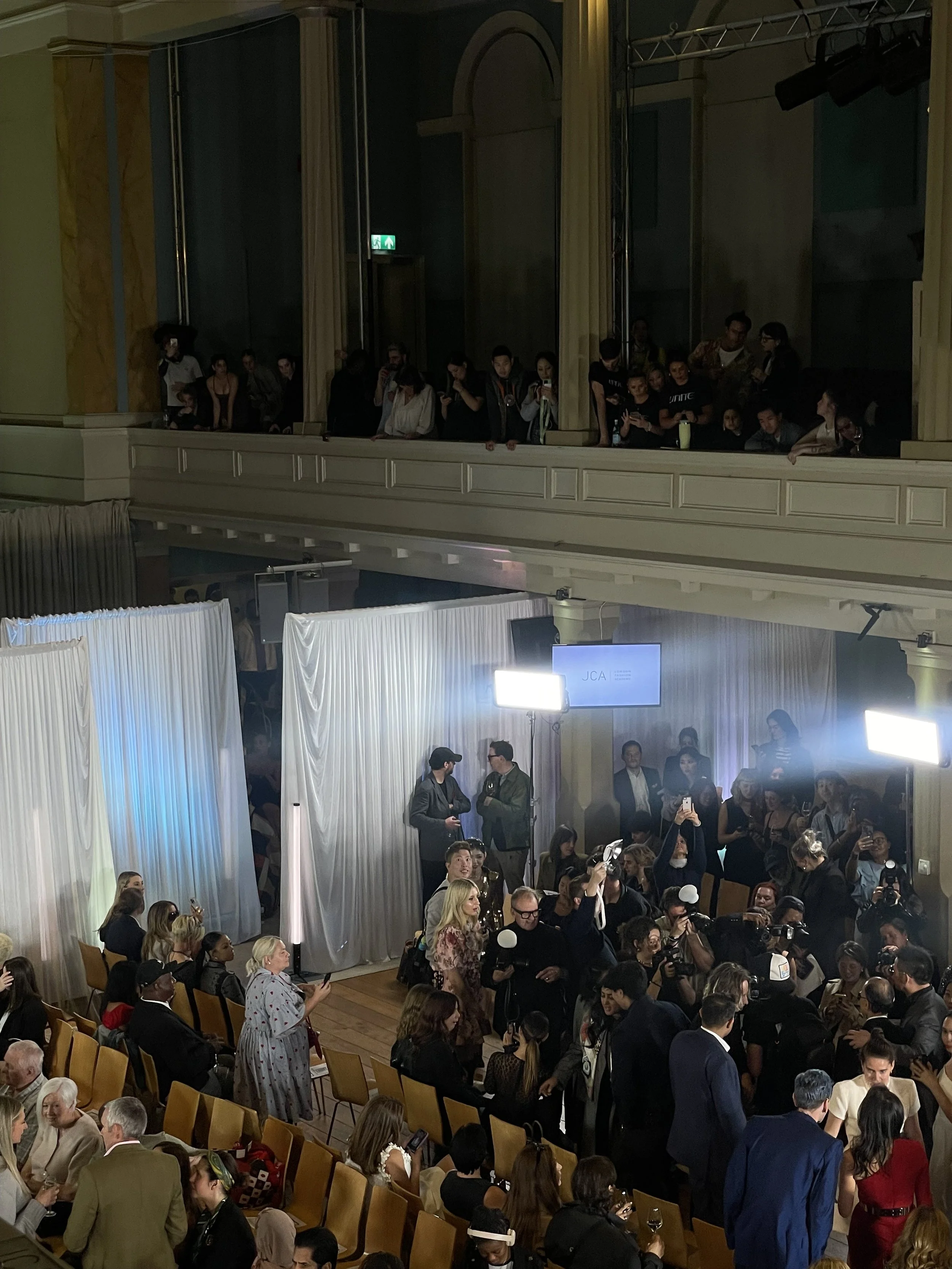 As the models come out, I pinch myself. Each designer has handpicked everything from the music, to the designs and even the models. Where one designer has dedicated their entire collection to ball gowns, a next look only features tuxedos. Some of the models come out vogueing and interacting with the audience, even getting a titter from Jimmy. At one point I think the show has been taken over by a Just Stop Oil protest but I realise that their voice is just booming over the speakers, adding to the dramatics of their collection. There’s feathers, sequins, and chiffon dresses that have been hand painted. I recognise a few of the models in the queue prior having a cigarette outside. Far from the relaxed demeanour they had puffing on Marlboro Golds earlier, they had now transformed into sashaying robots, carrying each of the designs with a grace and poise that also removed them from the clothes, simultaneously ensuring that each piece has it’s time to shine in it’s own unique way.